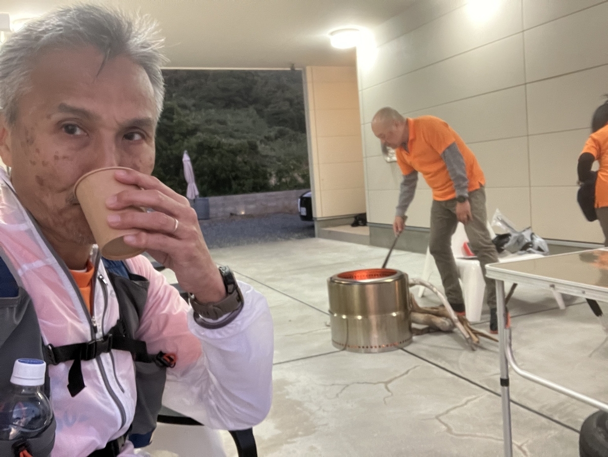 樺島へ右折する三叉路の少し手前で、いつもの私設エイド。温かい甘酒を頂く。最高。